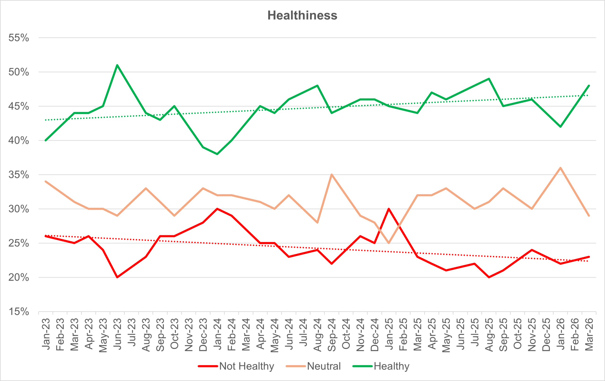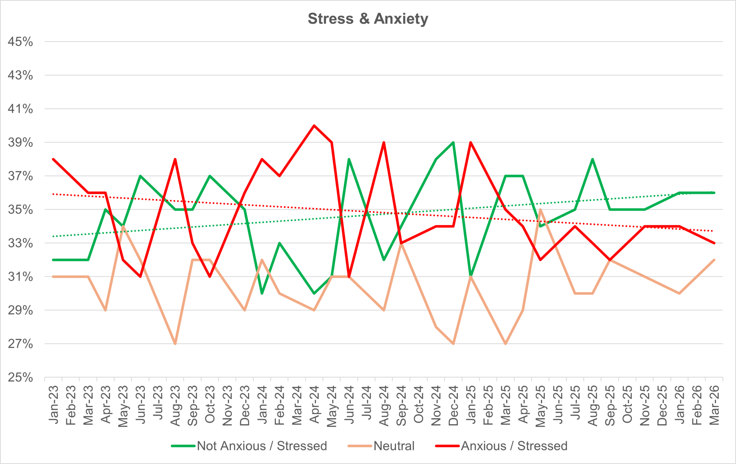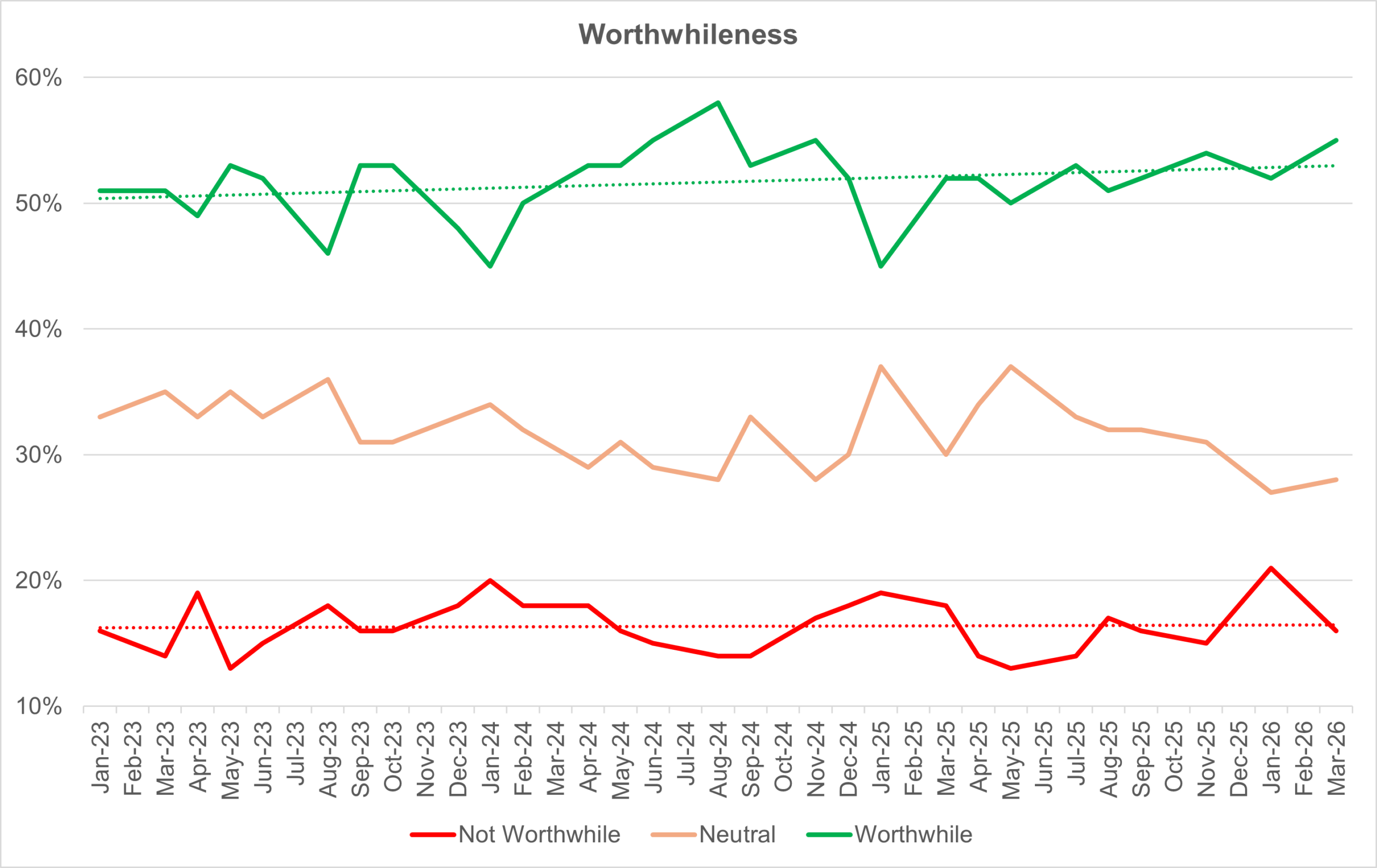 Each chart also shows (as a dotted line) the trend line for the positive and negative measures over the reporting period – to give an indication of direction of travel.